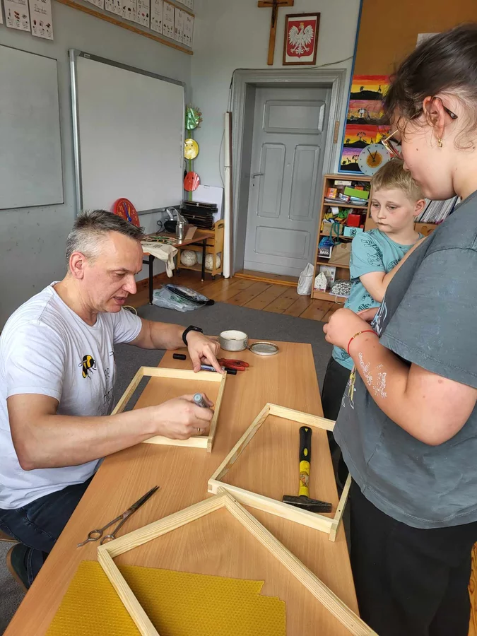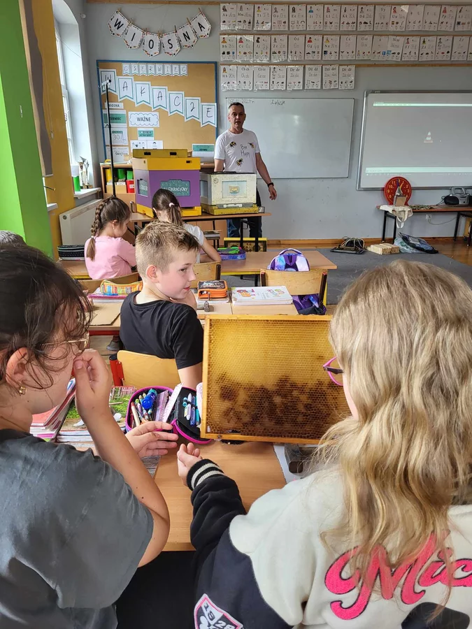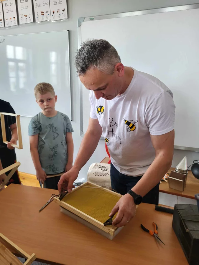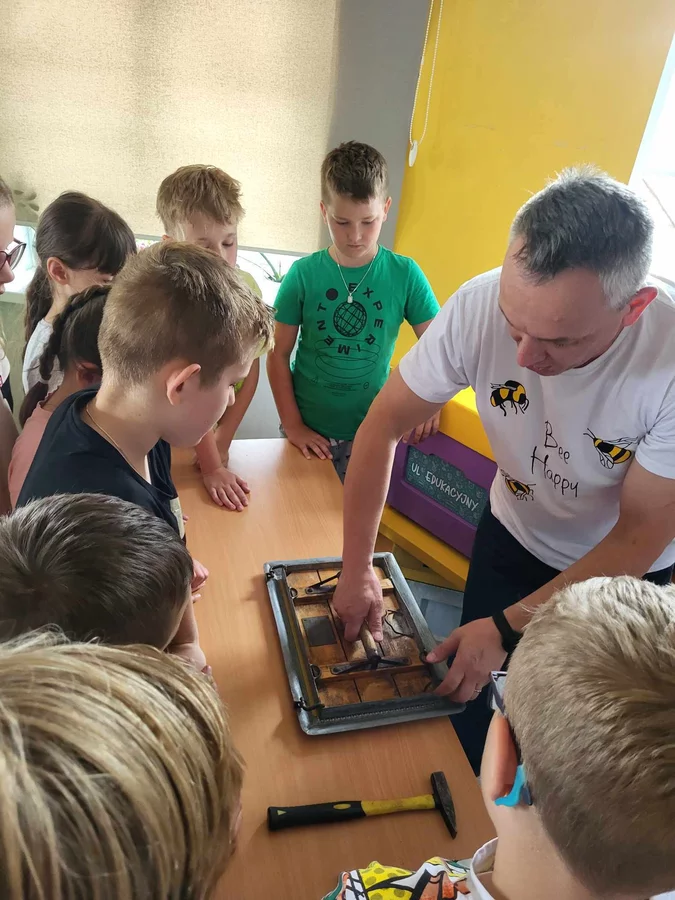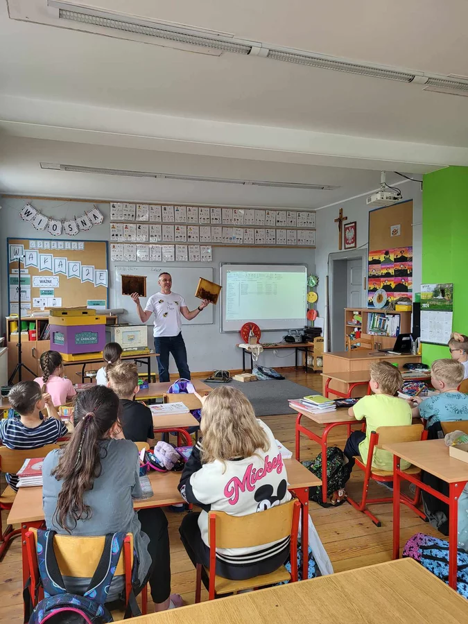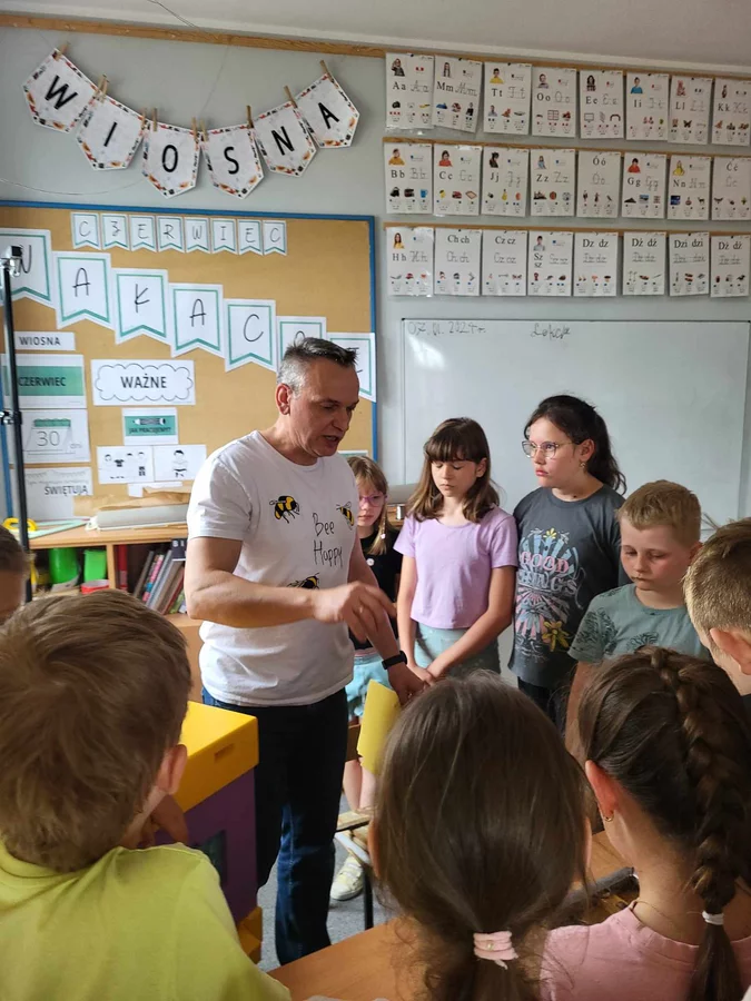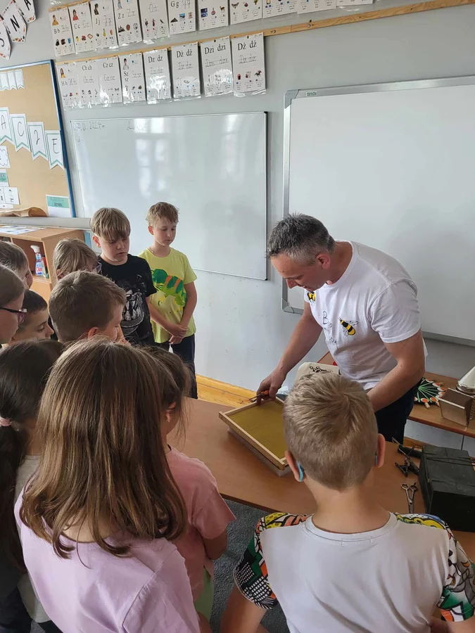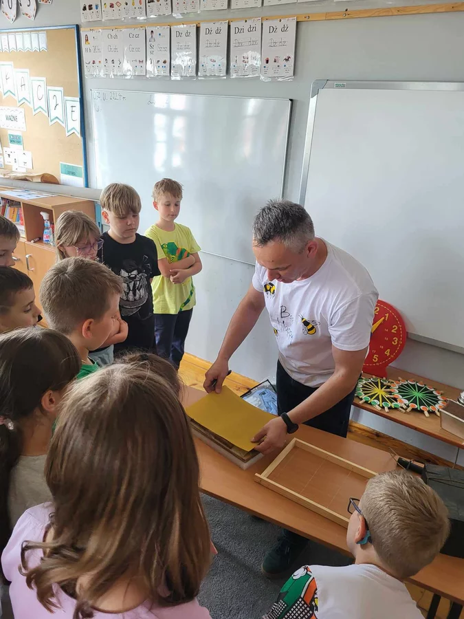 7 czerwca 2024 roku uczniowie klasy 3 w ramach programu Akademia Pszczoły Bohatera uczestniczyli w zajęciach dotyczących życia pszczół. Lekcję poprowadził Pan dyrektor Daniel Piasecki. Dzieci obejrzały dwa filmy edukacyjne: Życie pszczoły oraz Budowa ula. Dowiedziały się co to są i jak są zbudowane ramki, węzy, poznali hierarchię jaka panuje w ulu. Następnie uczniowie mieli zadanie do wykonania. Musieli zbić ramkę. Po wbiciu gwoździ w ramkę, nawinęli drucik. Dyrektor zgrzał pod prądem węzę z naciągniętym drucikiem. Otrzymano w ten sposób gotową ramkę, która będzie miała zastosowanie w ulu. Dzięki temu robotnice będą miały pracę w ulu. Na zakończenie dyrektor pokazał dzieciom strój i przyrządy potrzebne do pracy pszczelarza. Dzieci miały też możliwość przymierzenia takiego stroju. Była to bardzo ciekawa lekcja.