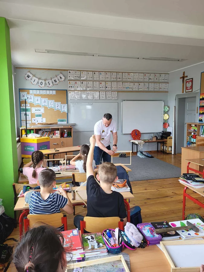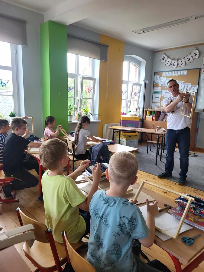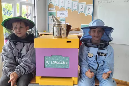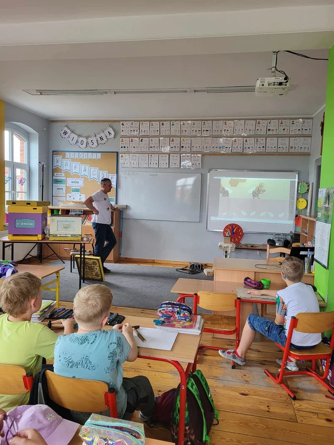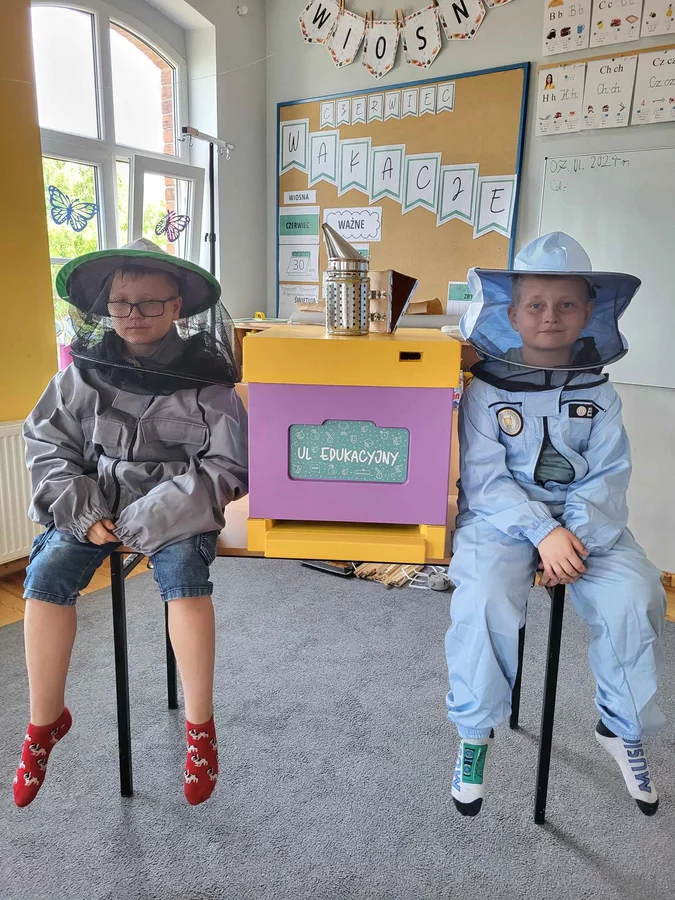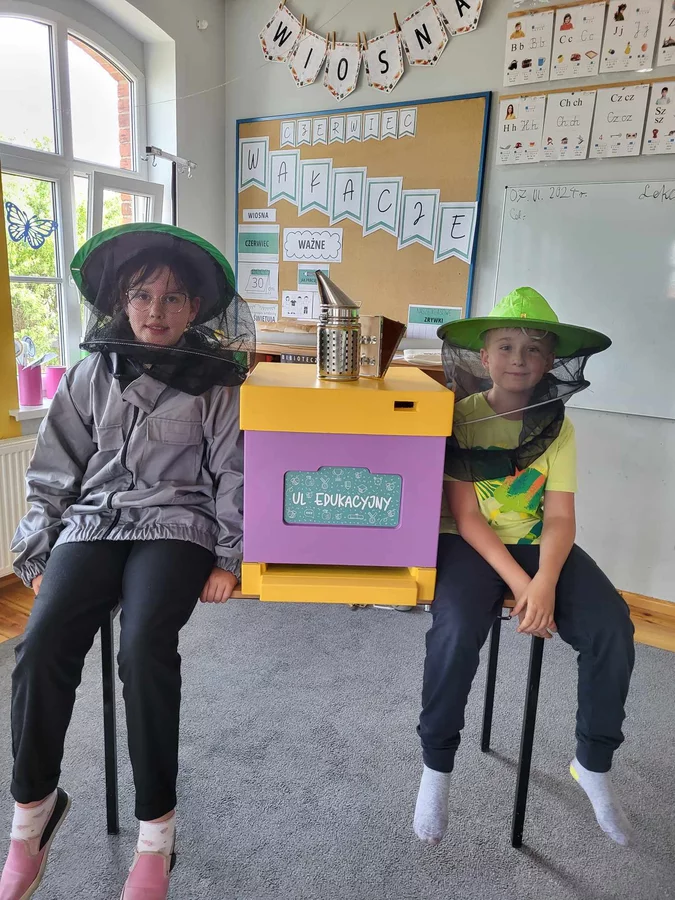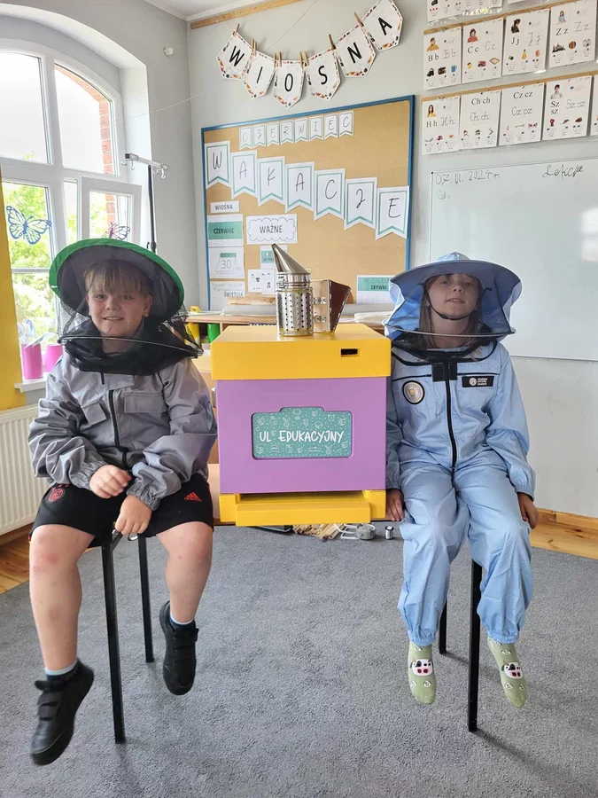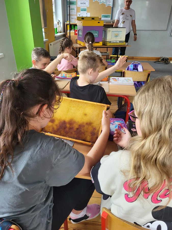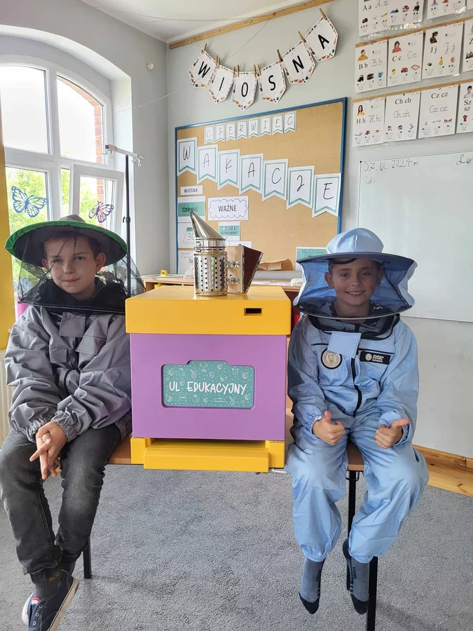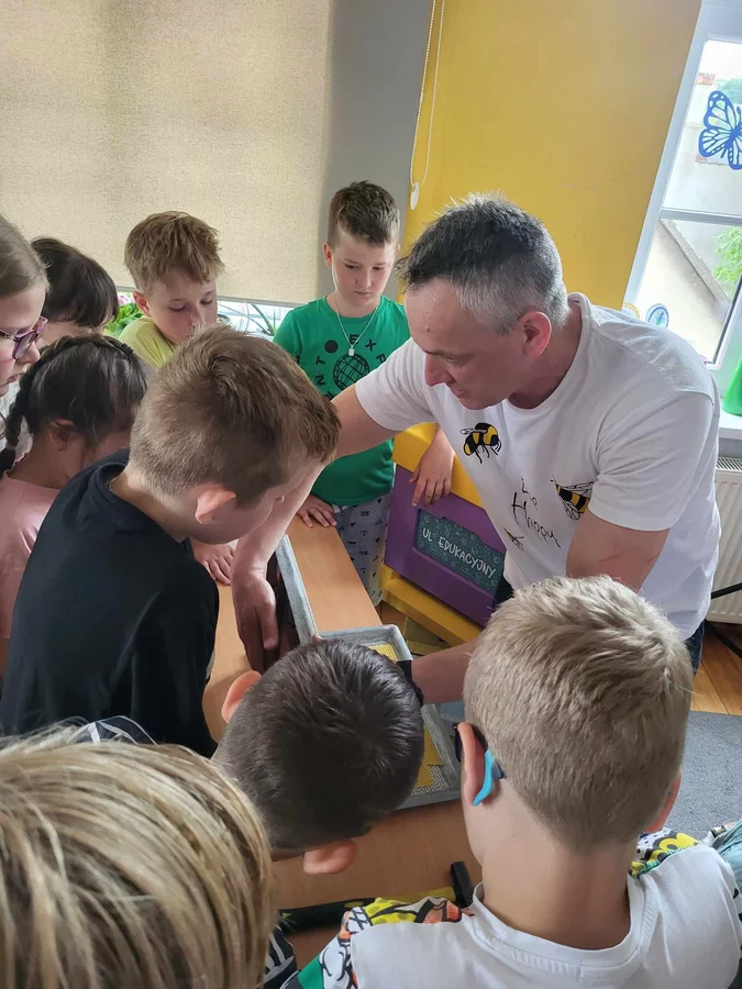 7 czerwca 2024 roku uczniowie klasy 3 w ramach programu Akademia Pszczoły Bohatera uczestniczyli w zajęciach dotyczących życia pszczół. Lekcję poprowadził Pan dyrektor Daniel Piasecki. Dzieci obejrzały dwa filmy edukacyjne: Życie pszczoły oraz Budowa ula. Dowiedziały się co to są i jak są zbudowane ramki, węzy, poznali hierarchię jaka panuje w ulu. Następnie uczniowie mieli zadanie do wykonania. Musieli zbić ramkę. Po wbiciu gwoździ w ramkę, nawinęli drucik. Dyrektor zgrzał pod prądem węzę z naciągniętym drucikiem. Otrzymano w ten sposób gotową ramkę, która będzie miała zastosowanie w ulu. Dzięki temu robotnice będą miały pracę w ulu. Na zakończenie dyrektor pokazał dzieciom strój i przyrządy potrzebne do pracy pszczelarza. Dzieci miały też możliwość przymierzenia takiego stroju. Była to bardzo ciekawa lekcja.