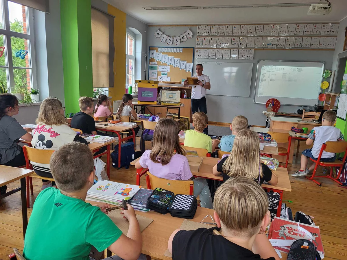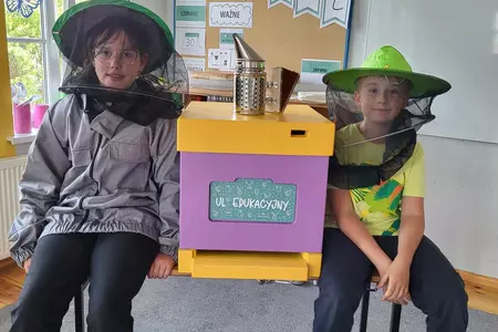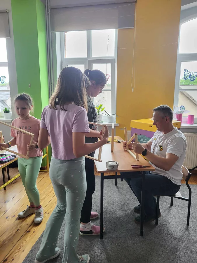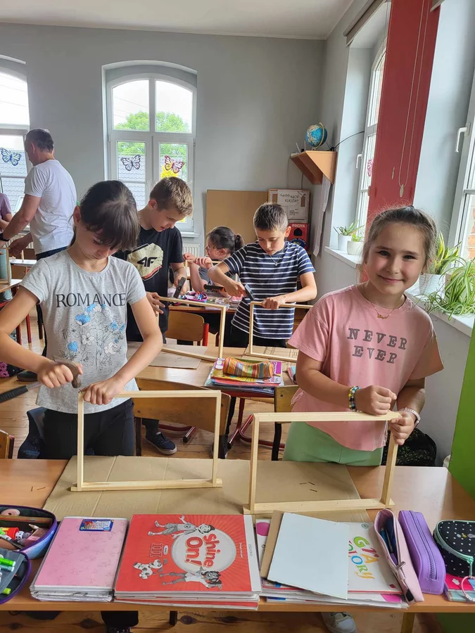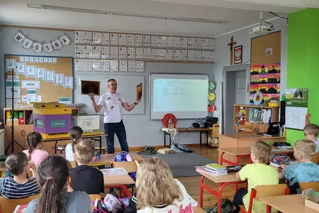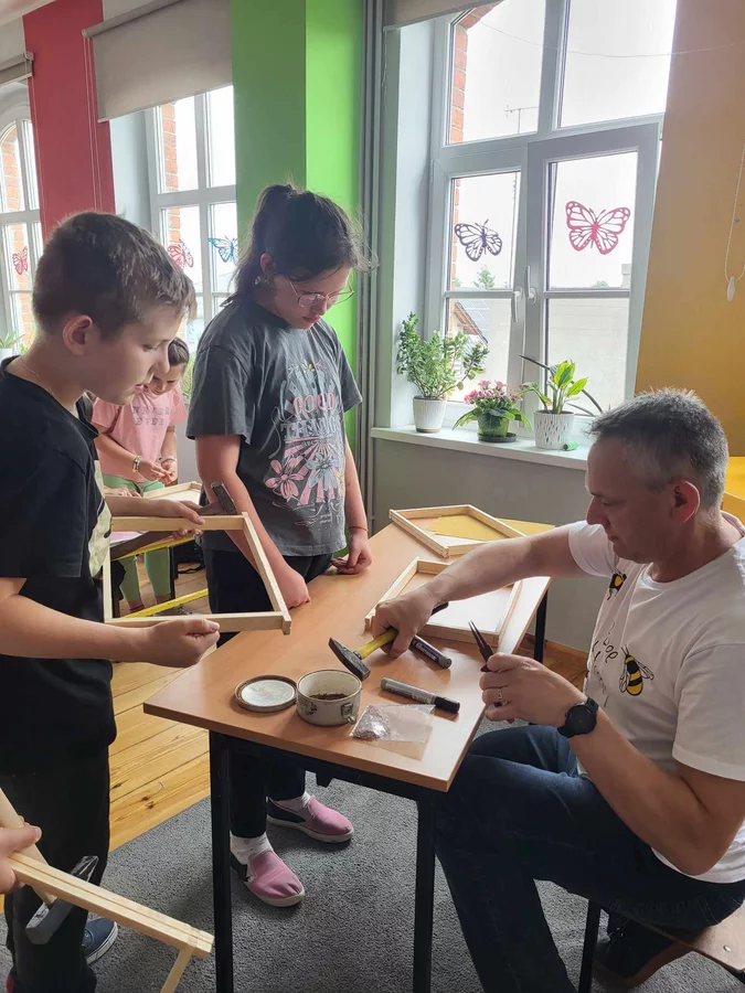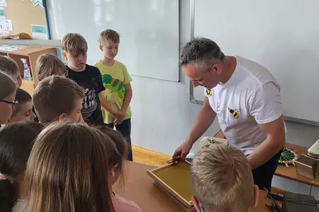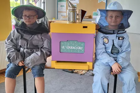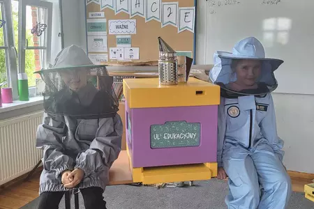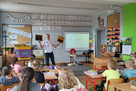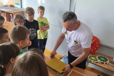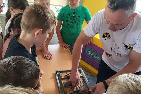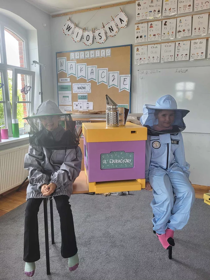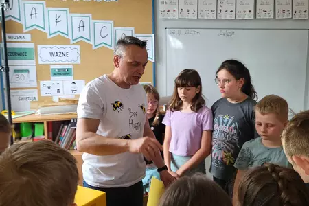 7 czerwca 2024 roku uczniowie klasy 3 w ramach programu Akademia Pszczoły Bohatera uczestniczyli w zajęciach dotyczących życia pszczół. Lekcję poprowadził Pan dyrektor Daniel Piasecki. Dzieci obejrzały dwa filmy edukacyjne: Życie pszczoły oraz Budowa ula. Dowiedziały się co to są i jak są zbudowane ramki, węzy, poznali hierarchię jaka panuje w ulu. Następnie uczniowie mieli zadanie do wykonania. Musieli zbić ramkę. Po wbiciu gwoździ w ramkę, nawinęli drucik. Dyrektor zgrzał pod prądem węzę z naciągniętym drucikiem. Otrzymano w ten sposób gotową ramkę, która będzie miała zastosowanie w ulu. Dzięki temu robotnice będą miały pracę w ulu. Na zakończenie dyrektor pokazał dzieciom strój i przyrządy potrzebne do pracy pszczelarza. Dzieci miały też możliwość przymierzenia takiego stroju. Była to bardzo ciekawa lekcja.