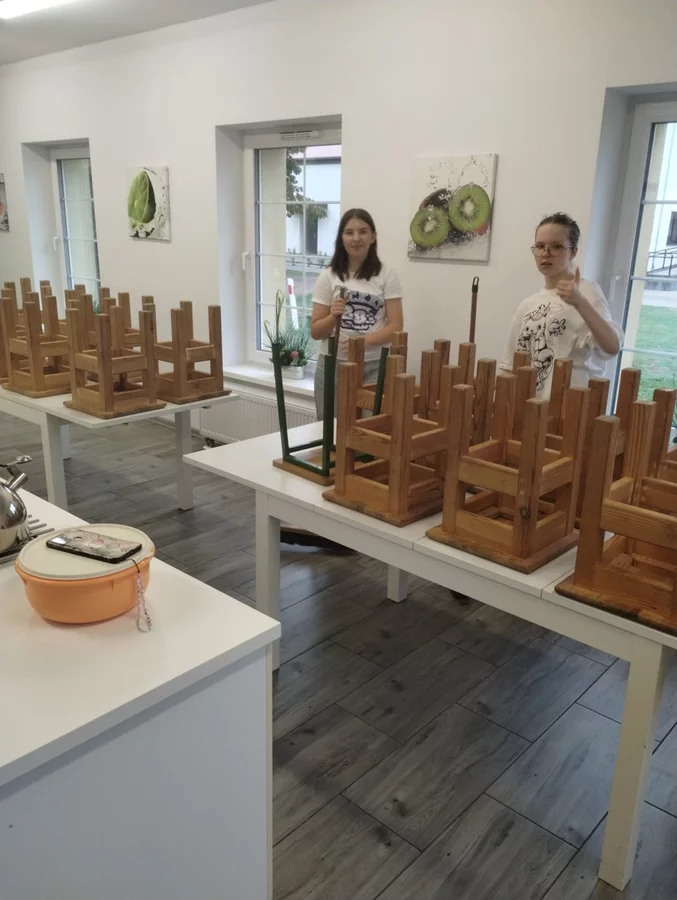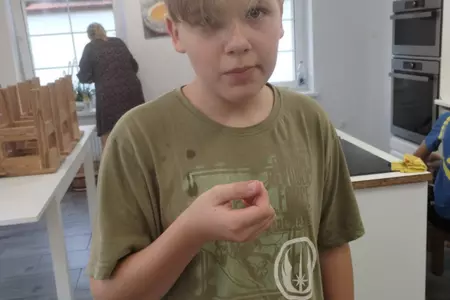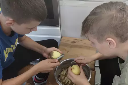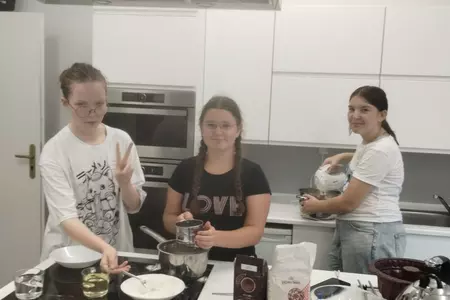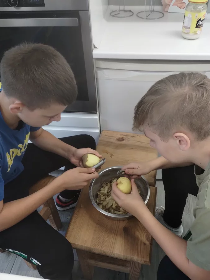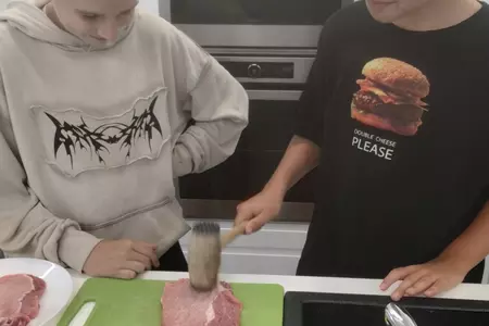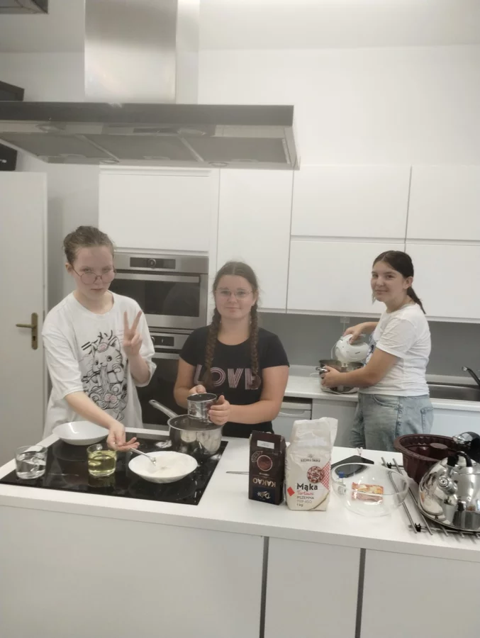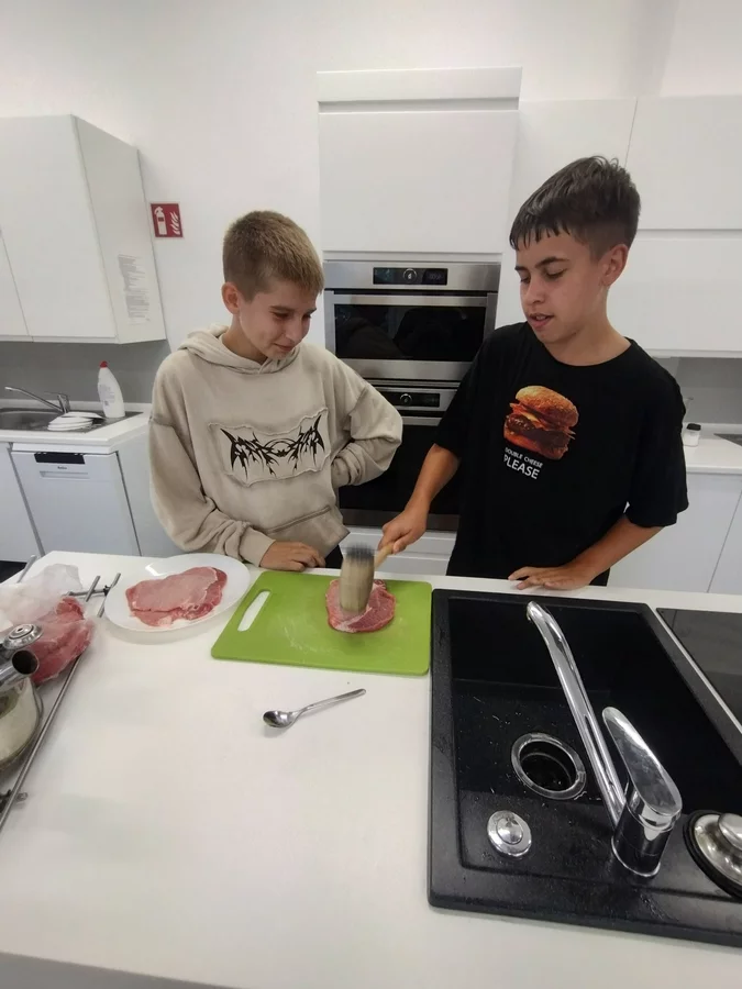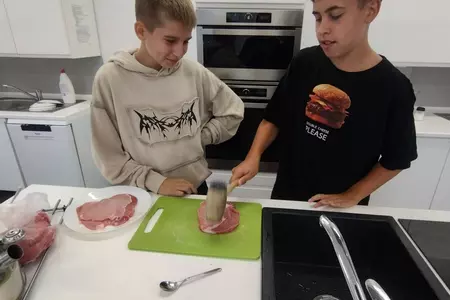 Klasa VII rozpoczęła w tym roku szkolnym zajęcia z gotowania tradycyjnym polskim obiadem. Uczniowie przygotowali kotlety schabowe, ziemniaki puree oraz surówkę z kapusty. Na deser upiekli babkę zebrę. Wszystko było pyszne i od razu zniknęło z talerzy!