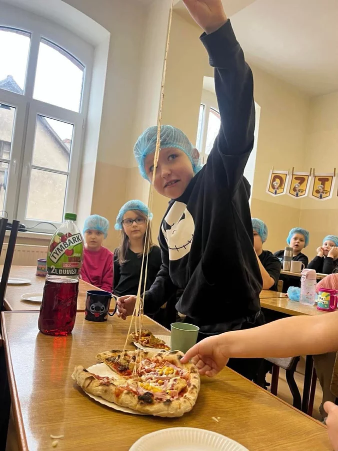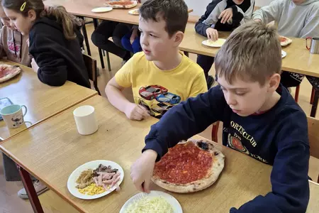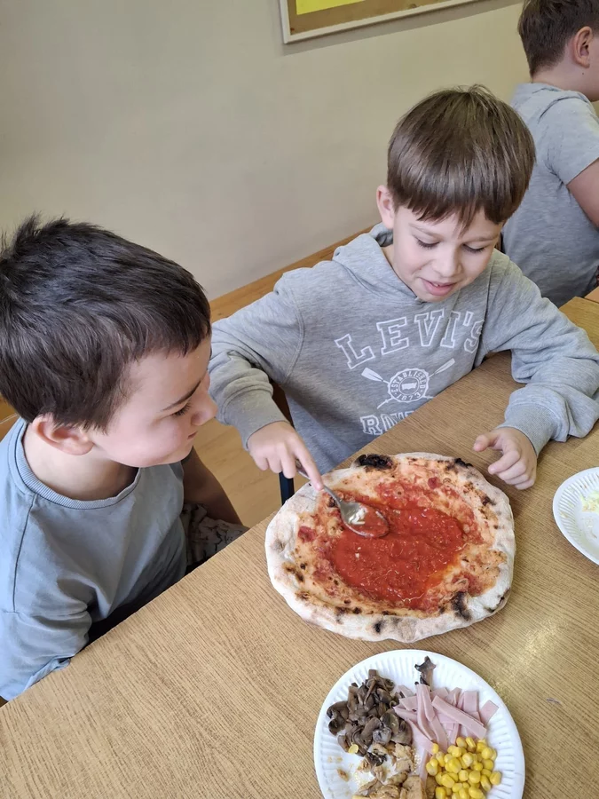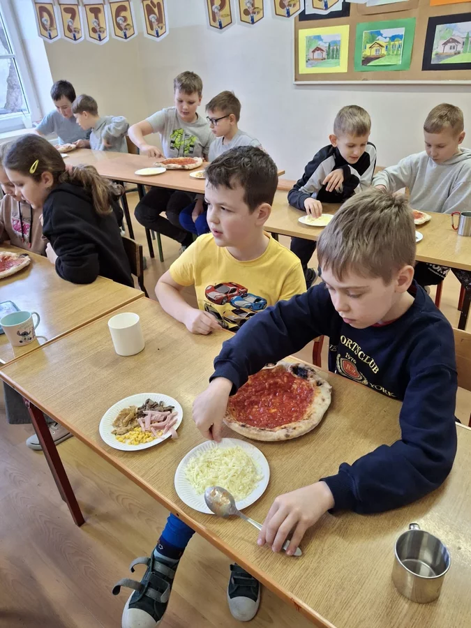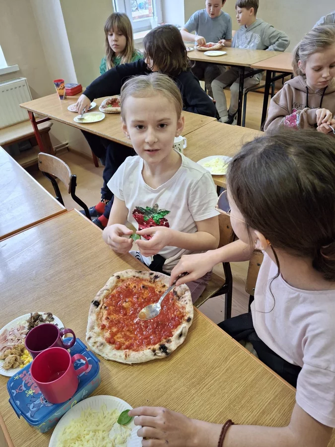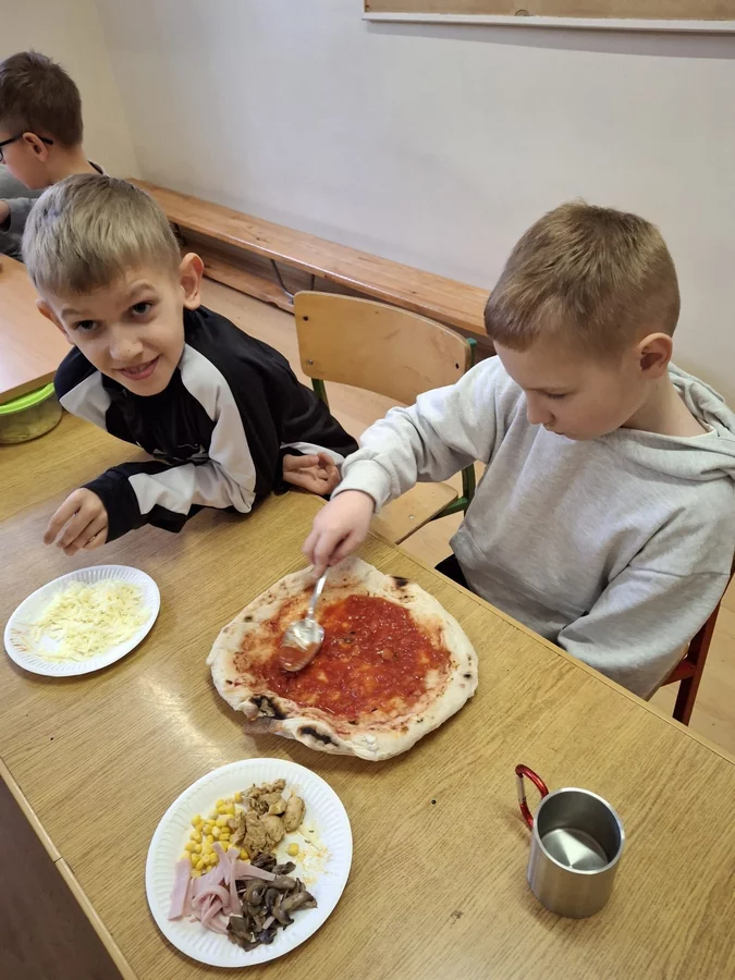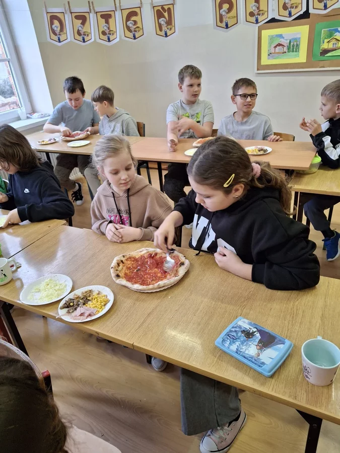 10 lutego 2026r. uczniowie klas I-III brali udział w warsztatach kulinarnych. Dzieci nauczyły się jak prawidłowo przygotować ciasto na pizzę. Każda para mogła samodzielnie ułożyć ulubione produkty na wierzchu. Wszystko odbywało się przy wskazówkach kucharza Michała i pani Ani. Dzieci mogły obserwować cały proces powstawania pizzy do momentu jej wypieczenia w piekarniku. Na koniec nastąpiła degustacja. Było pysznie! Wszystko odbywało się w miłej atmosferze i przy dużym zaangażowaniu prowadzących.