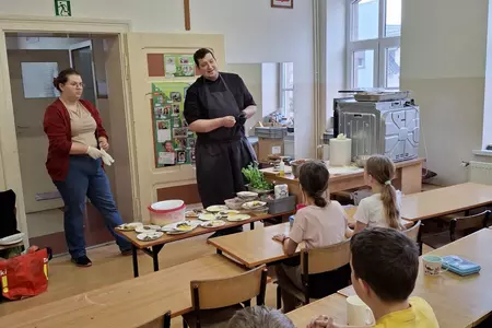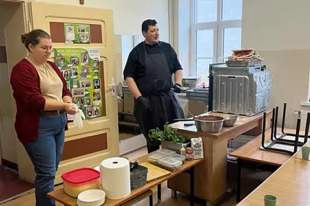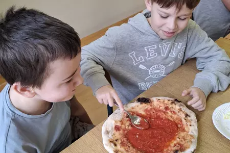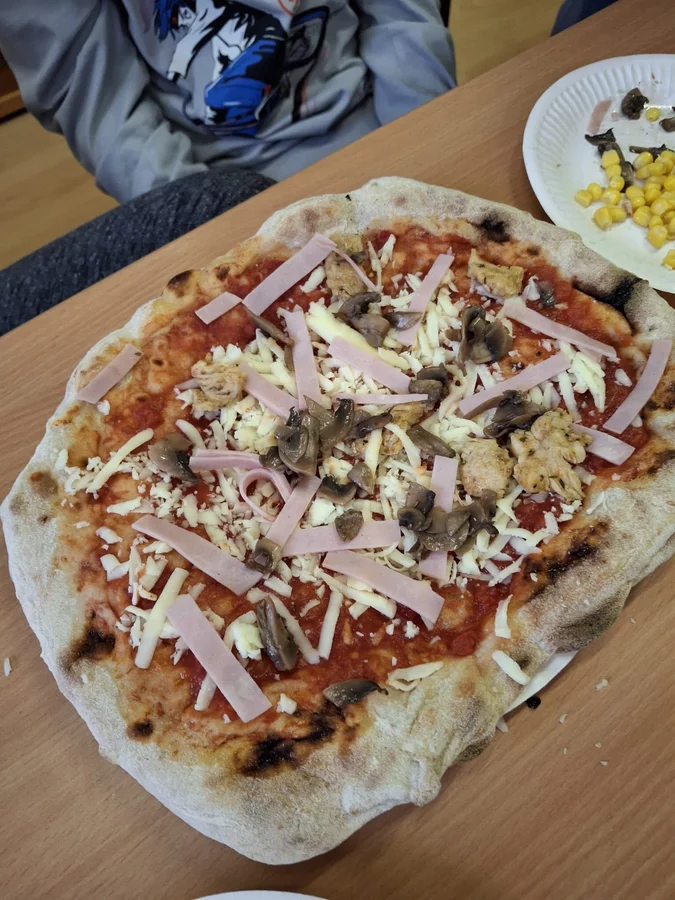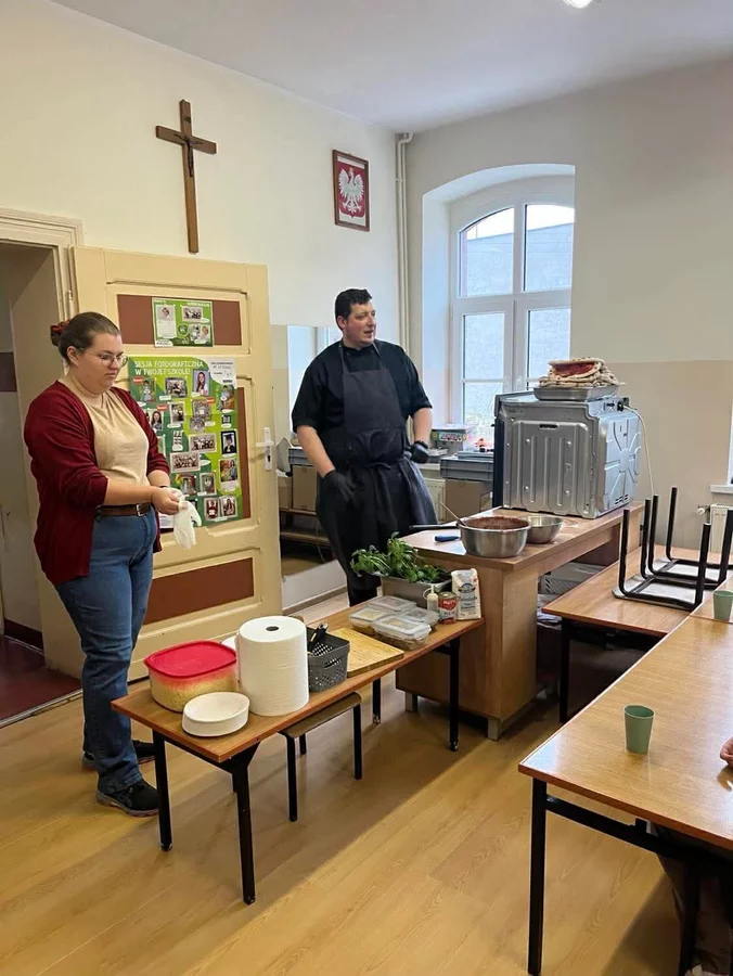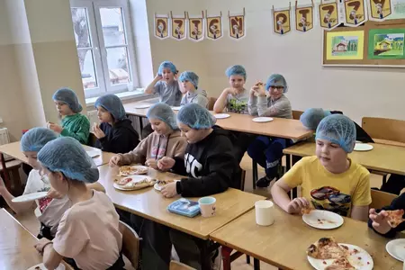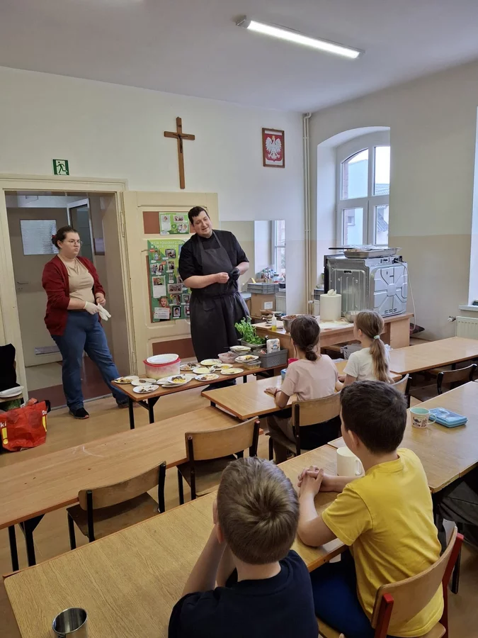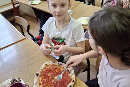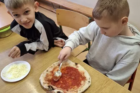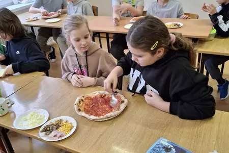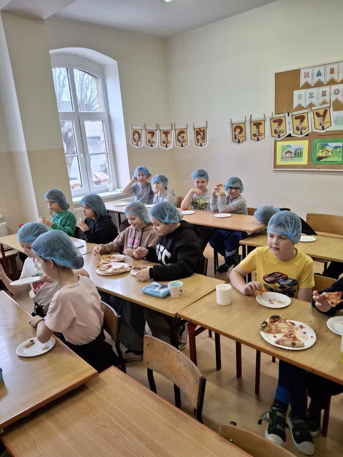 10 lutego 2026r. uczniowie klas I-III brali udział w warsztatach kulinarnych. Dzieci nauczyły się jak prawidłowo przygotować ciasto na pizzę. Każda para mogła samodzielnie ułożyć ulubione produkty na wierzchu. Wszystko odbywało się przy wskazówkach kucharza Michała i pani Ani. Dzieci mogły obserwować cały proces powstawania pizzy do momentu jej wypieczenia w piekarniku. Na koniec nastąpiła degustacja. Było pysznie! Wszystko odbywało się w miłej atmosferze i przy dużym zaangażowaniu prowadzących.