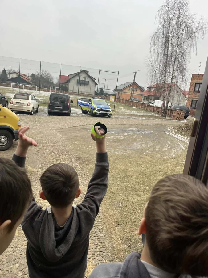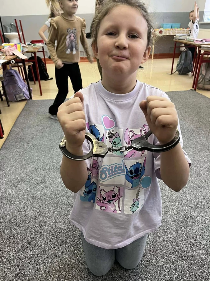 Pan policjant zaprezentował również elementy swojego wyposażenia. Uczniowie mogli zobaczyć kajdanki, pałkę policyjną, gaz obronny, bloczek do wypisywania mandatów oraz odznakę policyjną. Policjant wyjaśnił, do czego służy każdy z tych przedmiotów oraz w jakich sytuacjach jest używany. Za aktywny udział w zajęciach wszyscy uczniowie otrzymali odblaskowe opaski.