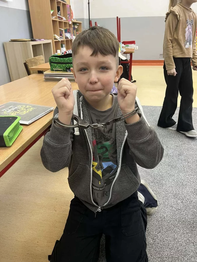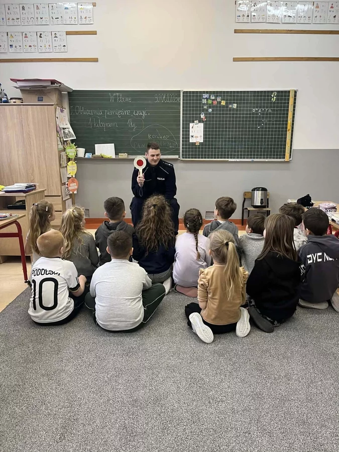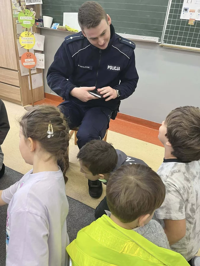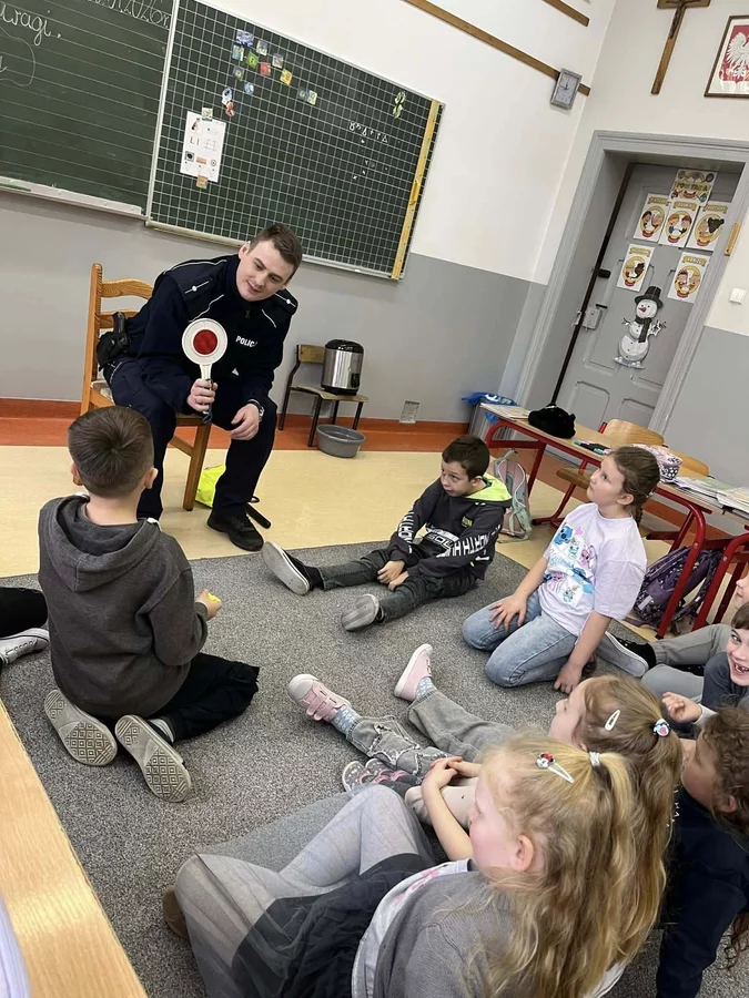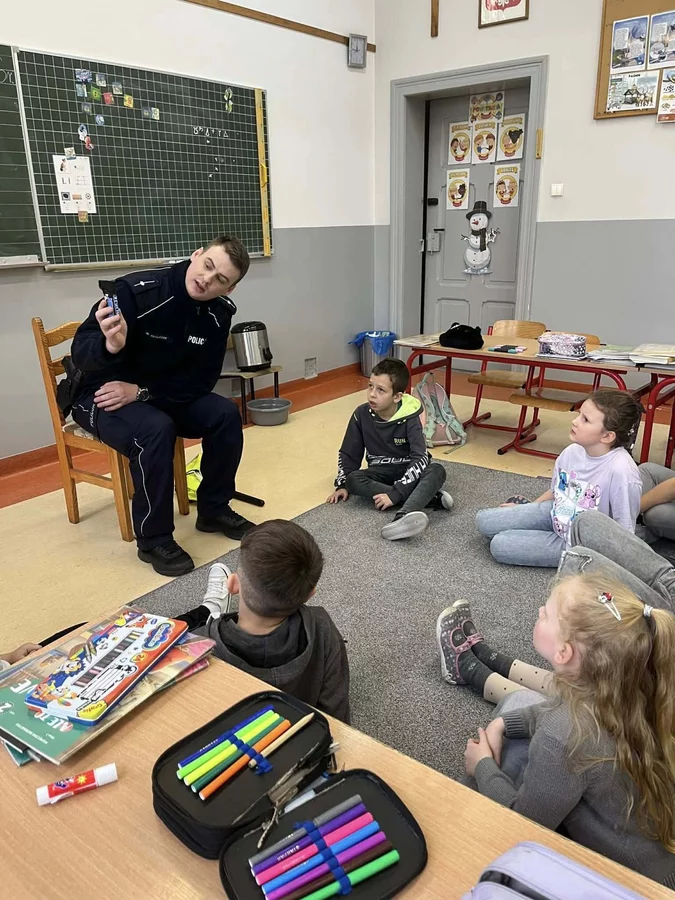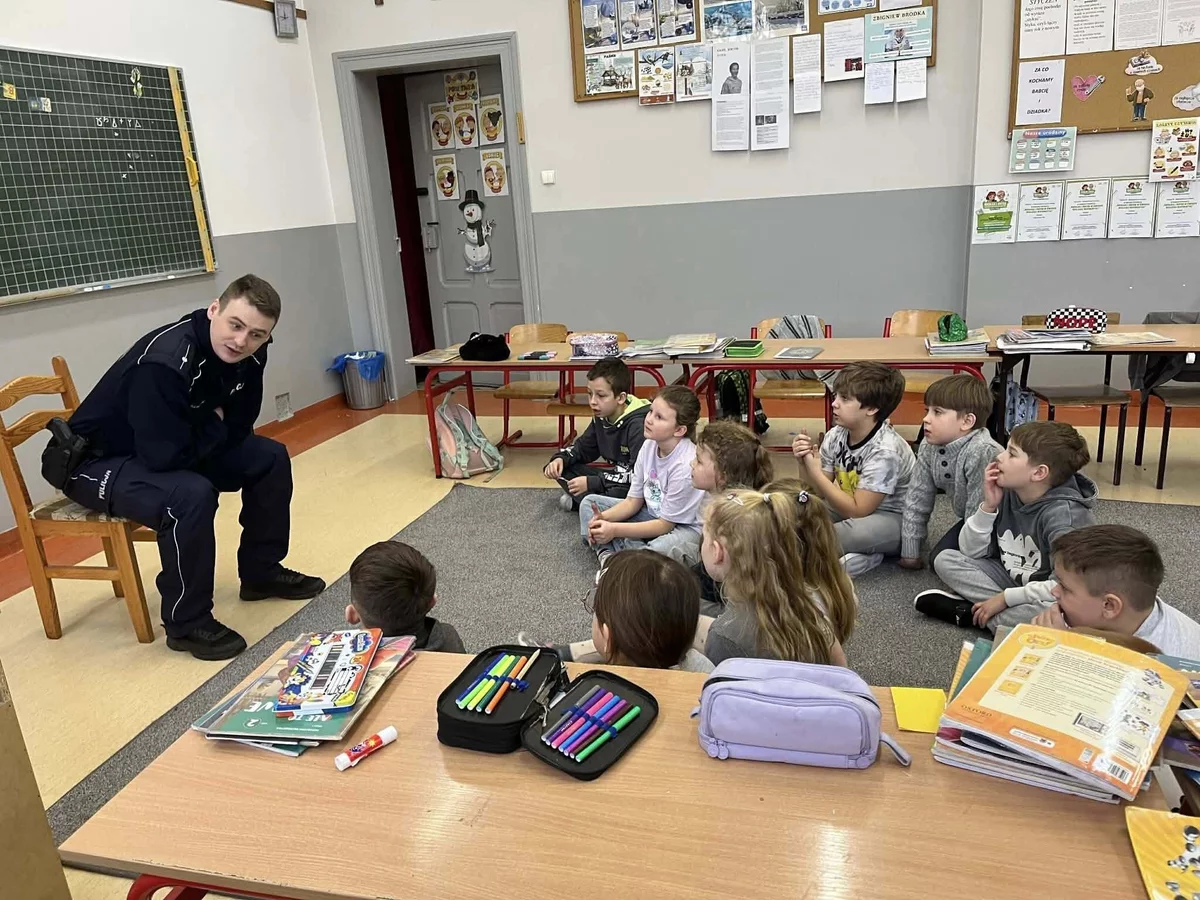 Dnia 30 stycznia w klasie 1 odbyło się spotkanie z policjantem. Dzielnicowy mł. asp. Maciej Ratajczak opowiedział o swoim zawodzie. Wyjaśnił, na czym polega praca policjanta, jakie zadania wykonuje na co dzień oraz jak wygląda jego służba. Uczniowie dowiedzieli się, że praca policjanta jest odpowiedzialna i wymaga odwagi, dyscypliny oraz pomocy innym ludziom.