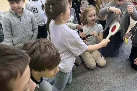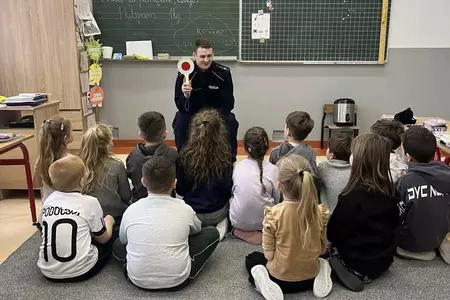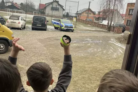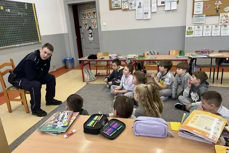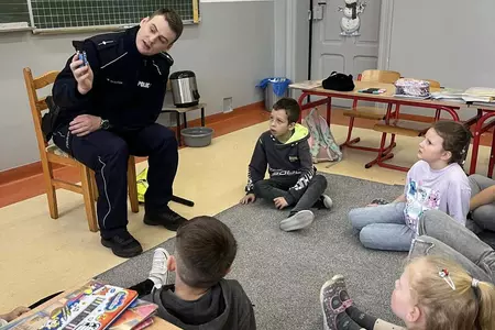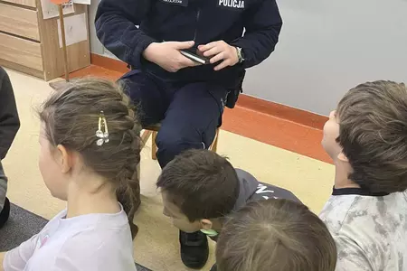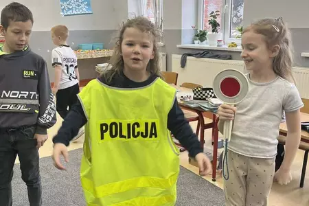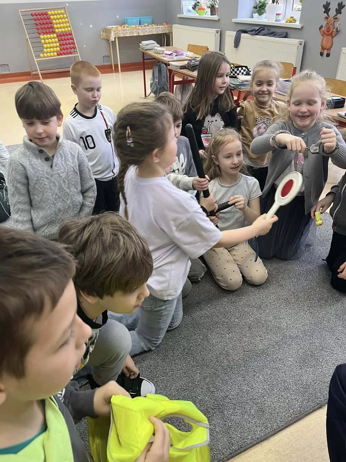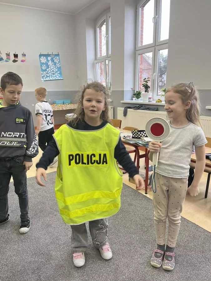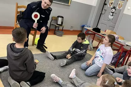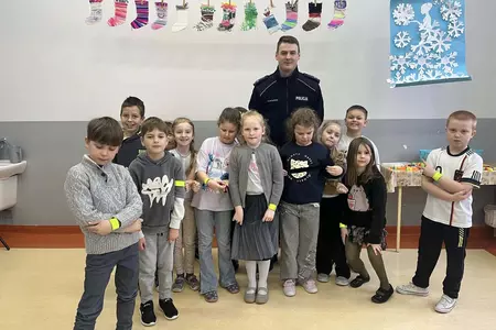 Następnie gość przypomniał zasady bezpiecznego poruszania się po ulicy. Omówił znaczenie sygnalizacji świetlnej, bezpiecznego przechodzenia przez jezdnię, zachowania ostrożności w pobliżu dróg oraz konieczność noszenia elementów odblaskowych, szczególnie po zmroku. Zwrócił także uwagę na zachowanie szczególnego bezpieczeństwa podczas zbliżających się ferii zimowych.